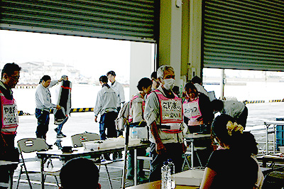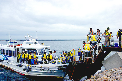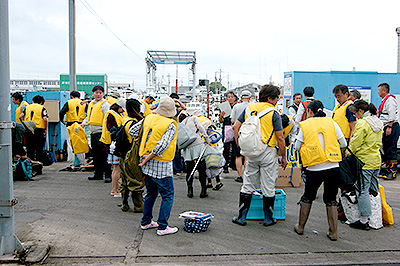 乗船前の注意事項説明の後に全員ライフジャケットを着用して、あすかケイエース彗星に乗って阪南2区人工干潟へいざ出発!