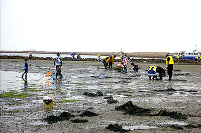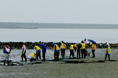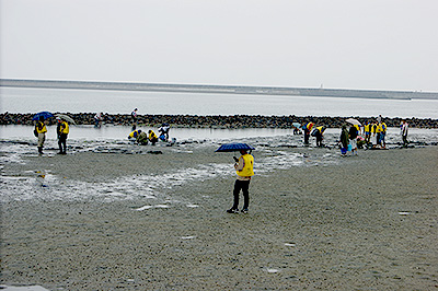 干潮時の干潟で子どもたちは雨が降る中、夢中で採取と観察をしていました。
