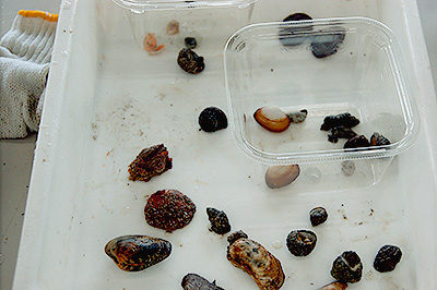 またスタッフに採取したハクセンシオマネキ、マテガイを見ていただいたり、マテガイの穴に塩を入れて出てくる様子を観察したりしていました。
